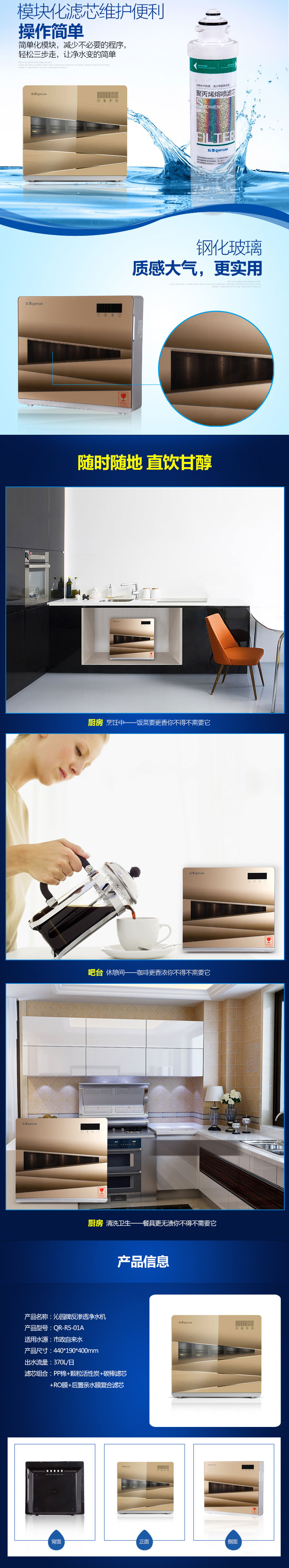 1、五級全精瞬濾,呵護您的飲水健康 2、經(jīng)典全封閉外觀,高貴典雅 3、智能濾芯壽命監(jiān)控,時時呵護您飲水健康 4、翻開式門開啟方式,讓操作更便利和直接 5、雙水質(zhì)、兩種選擇 ,實用更便利 6、臺階式結(jié)構(gòu)設(shè)計,安裝更便利, 7、模塊化濾芯維護便利,操作簡單 8、鋼化玻璃,質(zhì)感大氣,更實用 ◎適用水源:市政自來水 ◎濾芯組合:PP棉+顆粒活性炭+炭棒+RO膜+后置復合濾芯 ◎產(chǎn)品尺寸:440×190×400mm